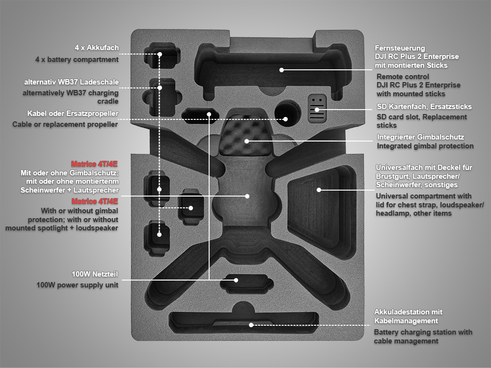 MAXIMUM PROTECTION AND “READY TO FLY”: Designed for professional use, this outdoor case provides complete protection for the DJI Matrice 4 series. The drone can be transported fully flight-ready with mounted propellers, with or without speaker/spotlight, and without the gimbal protector – enabling immediate deployment on-site. The gimbal is protected against shocks and damage by an integrated soft foam insert.
